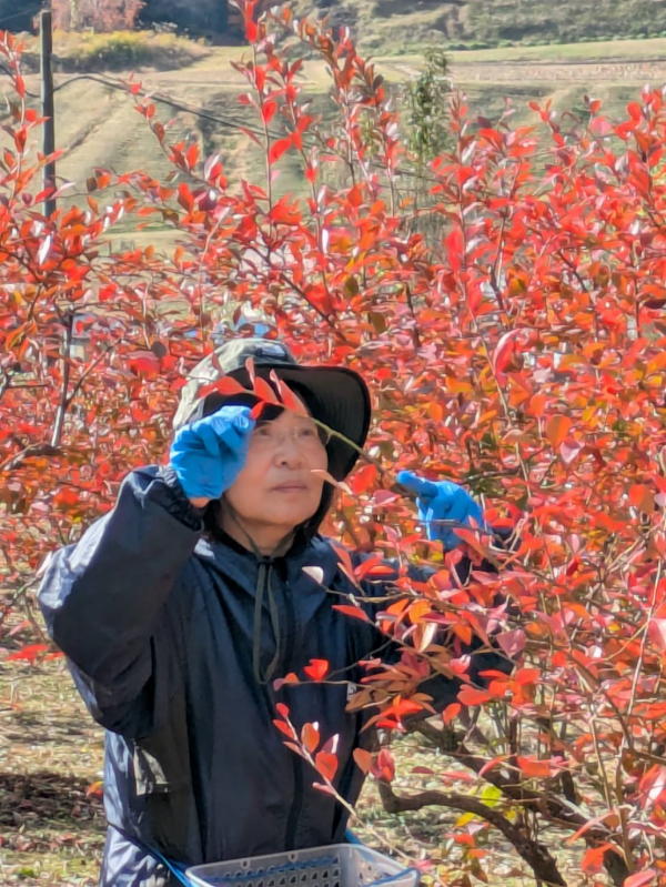 当農園のオリジナル商品ブルーベリー葉茶作りの為、真っ赤に色づいた葉の収穫作業が11月25日の福島民報新聞に掲載されました。